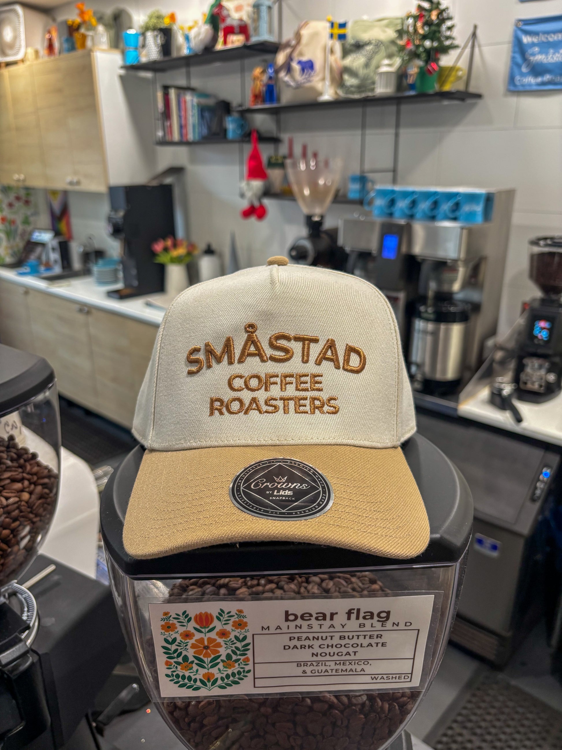 The Småstad Coffee Roasters logo is embroidered in rich brown across the front, offering a subtle contrast that complements the neutral color palette. Designed for versatility and comfort, this hat works just as well behind the bar as it does out in the sun—a simple, polished staple.